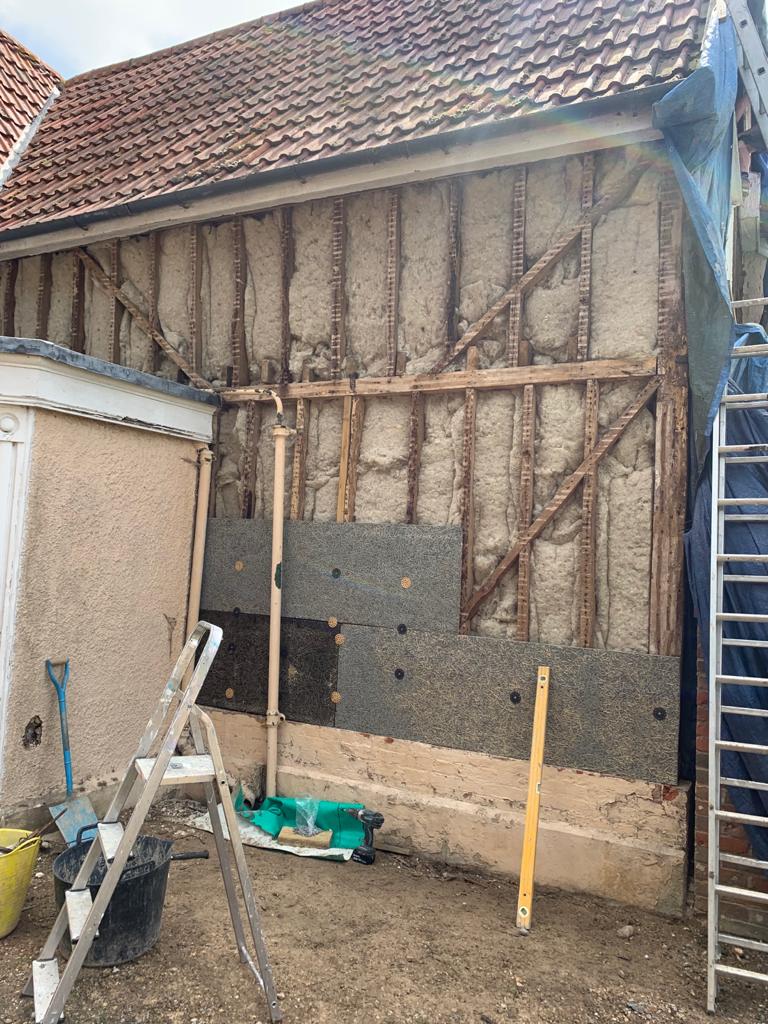 Progress is coming along nicely at Holton St Mary. We have worked on more elevations. Timber repairs have been carried out and treated with 5-star Cuprinol wood treatment. The building has been insulated with 100mm Sheep's wool insulation and boarded with 25mm Savolit boarding. It has a scratch coat of lime render below in preparation for the lime plaster.