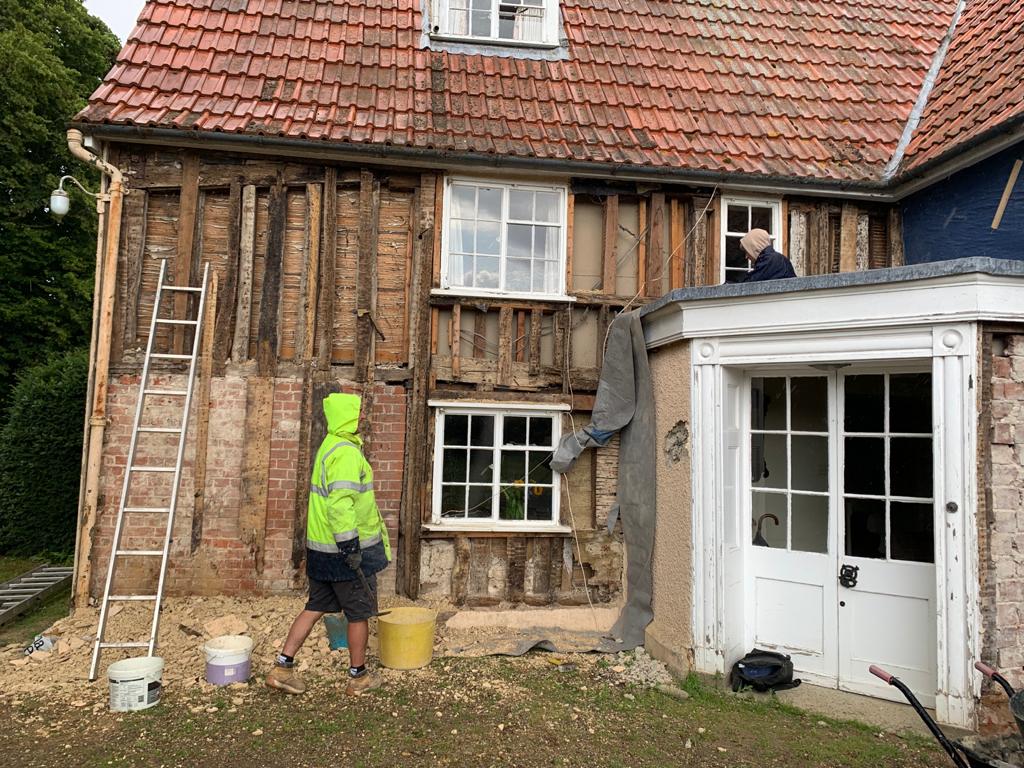 Our job at Holton St Mary is progressing nicely. We have removed the sand and cement render and repaired the building's timbers and applied wood treatment.