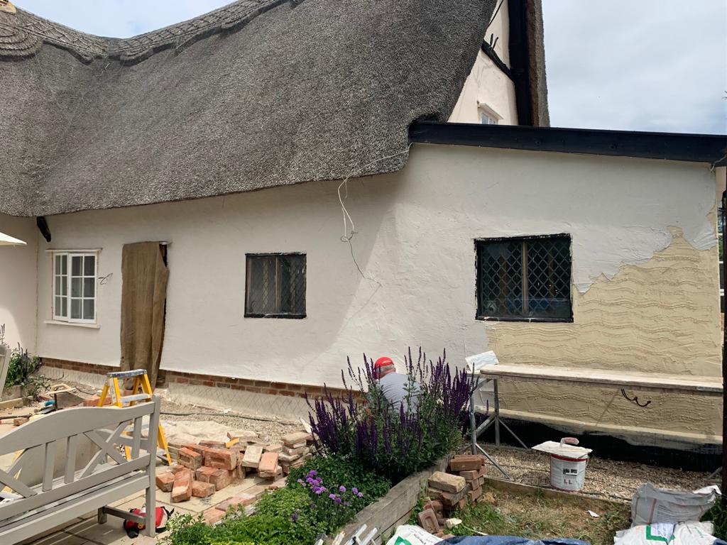 Once the sole plate was in, we set about implementing the oak stud and beam, followed with a traditional wattle and daub. One of the most common infills, this can be recognised by the charming irregularity of bulging panels. (However, we can do this fairly level if required.)