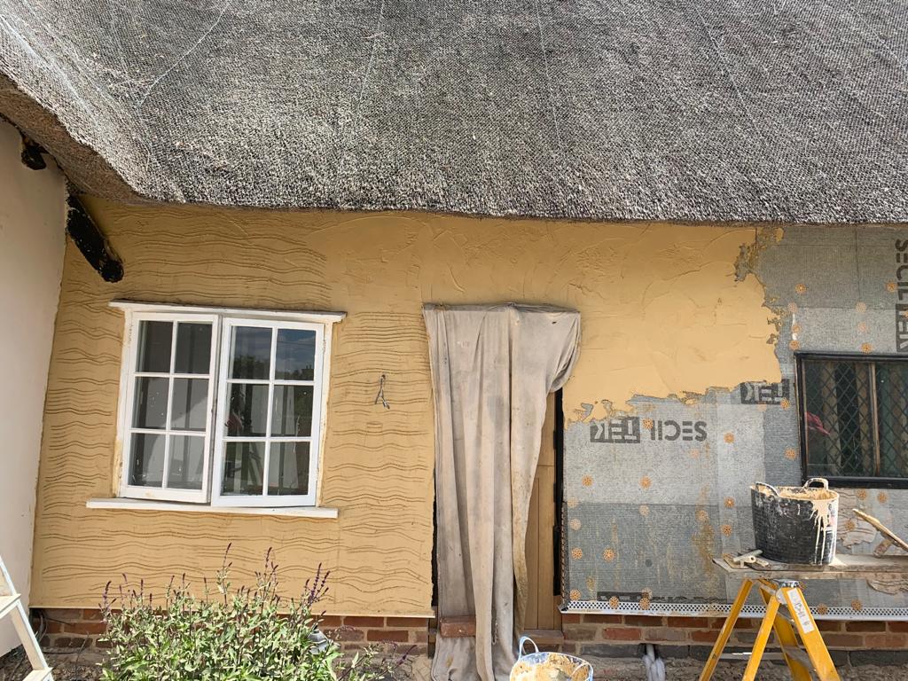 Once the daub had hardened, we set about dampening it and applying lime plaster. The plaster was finished flush, but in some projects, it is continued across the panels and timbers alike. This would allow less important timbers to be concealed and only principal members to be shown. This plaster can be smooth trowelled, rough cast or even parged (incised and/or built up with a pattern or design); its a lovely material to work with.