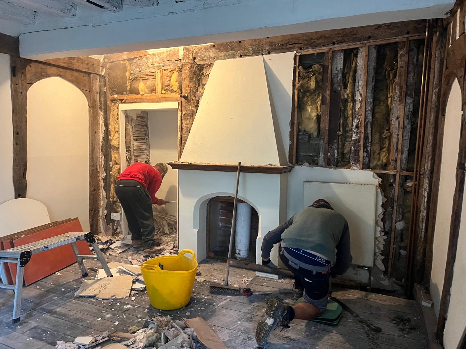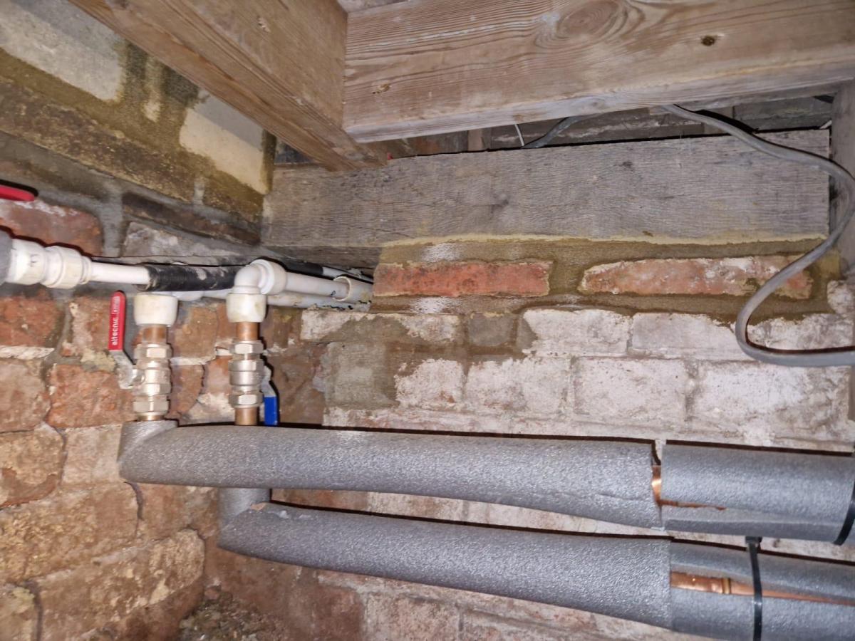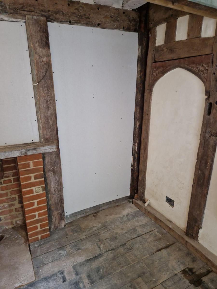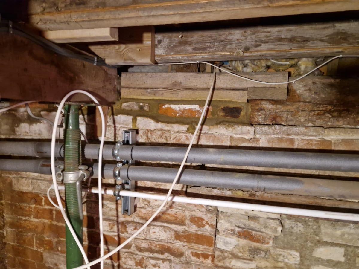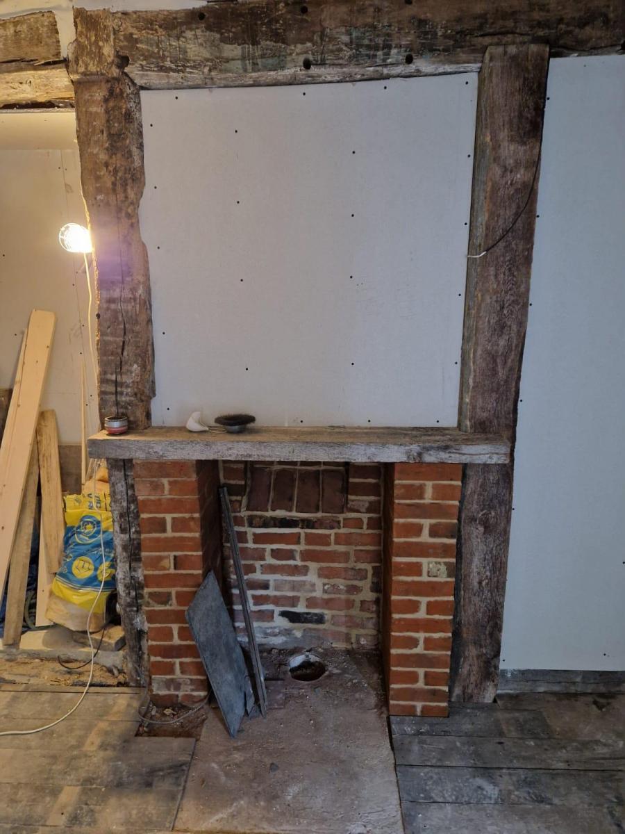 We are working on a new job in Debenham, Suffolk. This week we have installed a new heating system and sump pump into the cellar. We have also made structural repairs to the cellar, and to the sitting room above it. We have altered the height of the original chimney breast beam, and are getting ready for plastering.