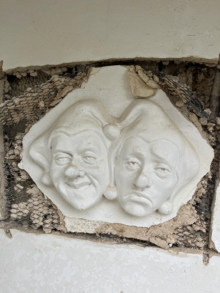 This moulding was on the building and will be going back on afterwards. It is the faces of two jesters, as a comedian supposedly lived at the property many years ago!