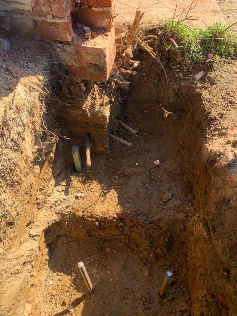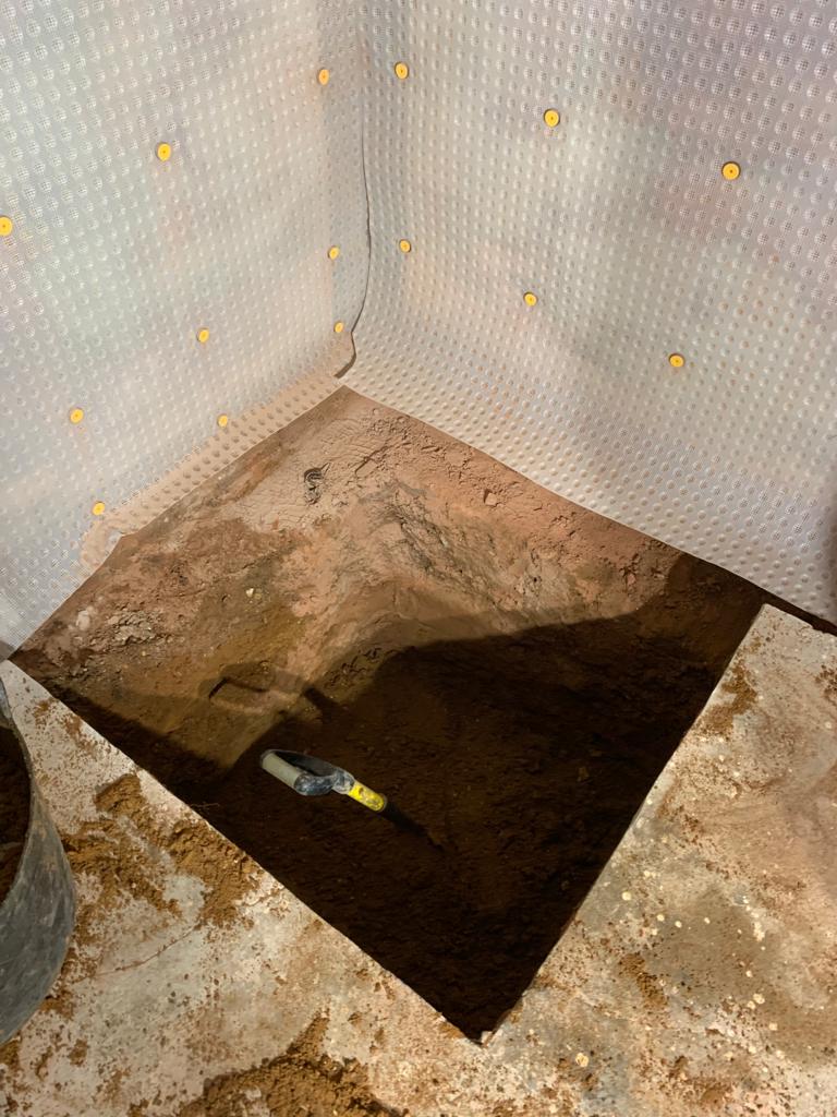The hole has been dug for the sump. The sump chamber is installed in the lowest part of the basement. Water is directed to the chamber via cavity wall membranes, where a pump can then expel the water to an external drain.