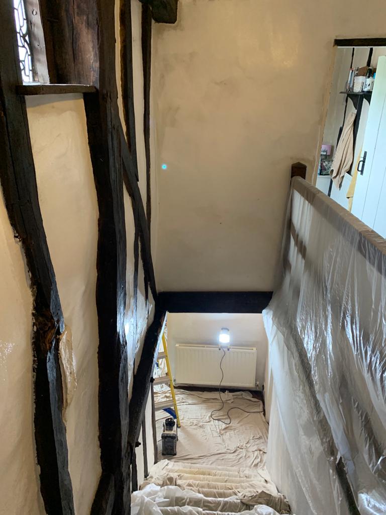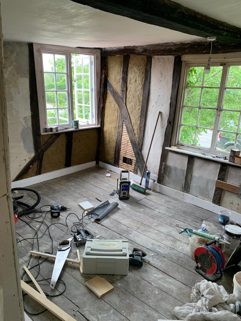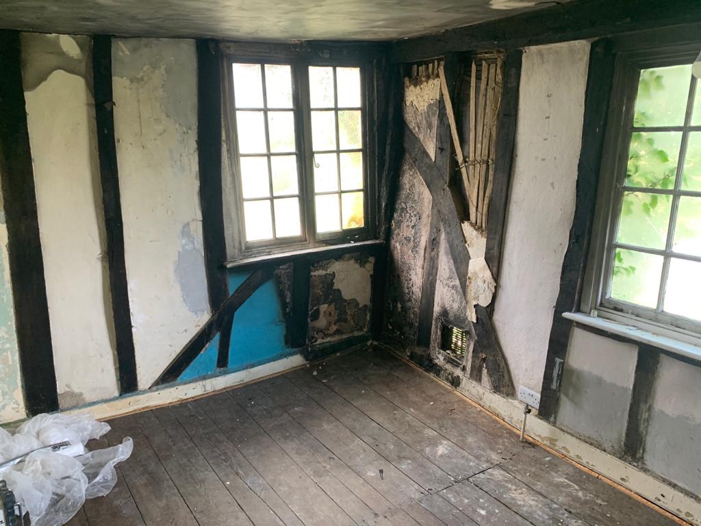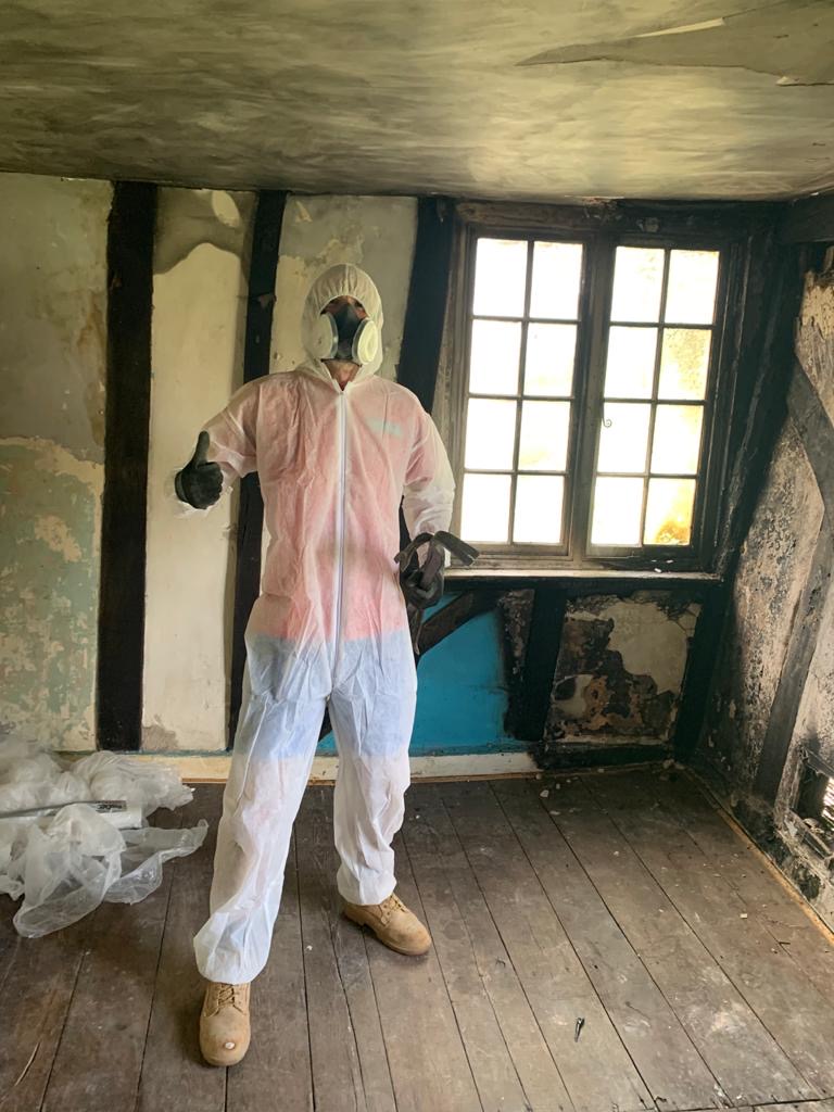 This week we started a new job through Smithers and Purslow Surveyors restoring a fire damaged property in Great Leighs. As you can see, we are having to wear protective clothing and masks for this job!