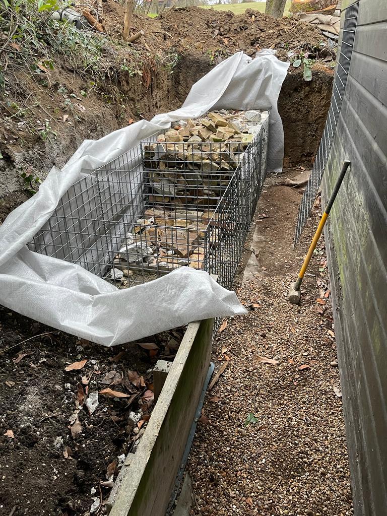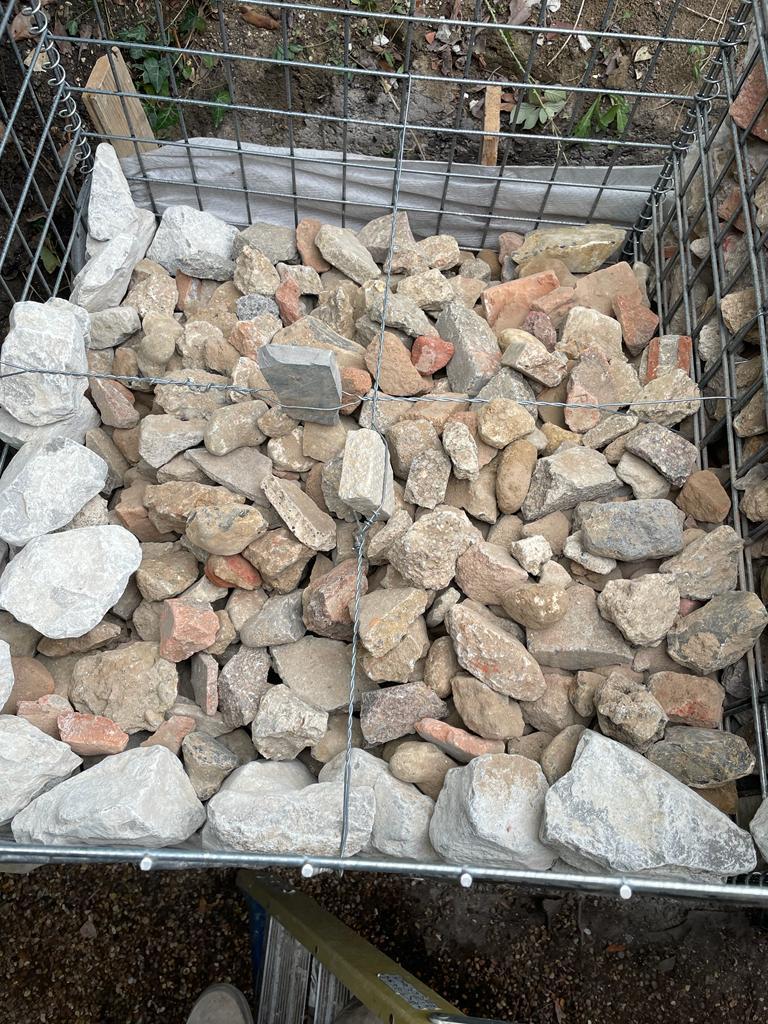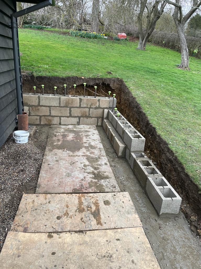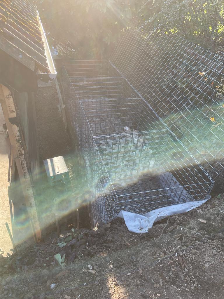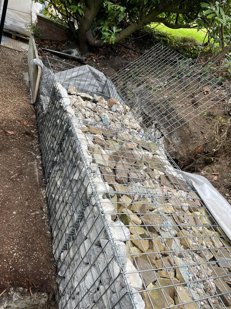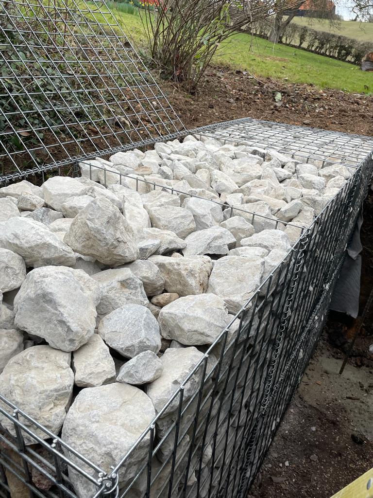 Wehave started a new job in Nayland this week, retaining a garage and outbuilding that have been affected by movement. We are installing retaining walls, gabions, block work and metal rods. Gabions are baskets/containers filled with stones or other material that are often used to stop or slow down run-off of water, ot to stabolize slopes that have seepage problems. They can also be used purely for aesthetic purposes, or to help retain walls and embankments. Sometimes they are used as noise barriers too.