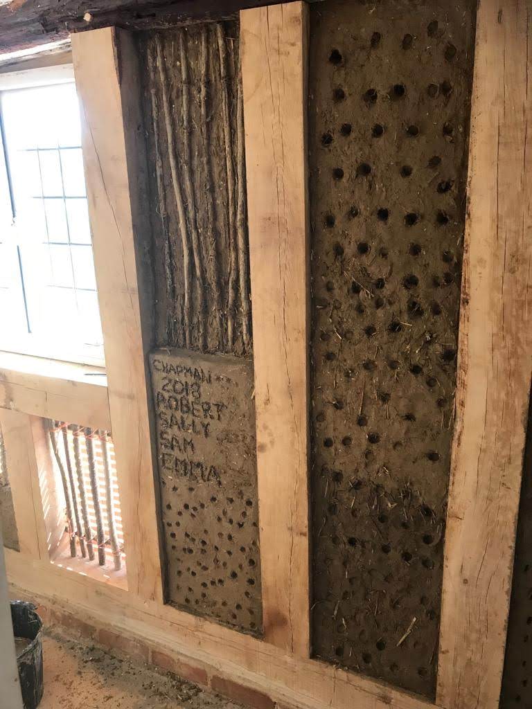 Once the sole plate was in, we set about implementing the oak stud and beam, followed with a traditional wattle and daub. One of the most common infills, this can be recognised by the charming irregularity of bulging panels. (However, we can do this fairly level if required.)